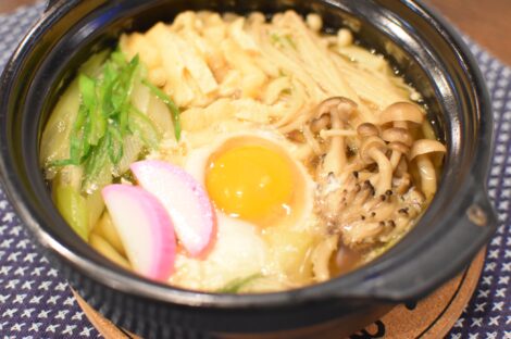 具材が煮えたら卵を溶いて回し入れ半熟状態で火を止める。